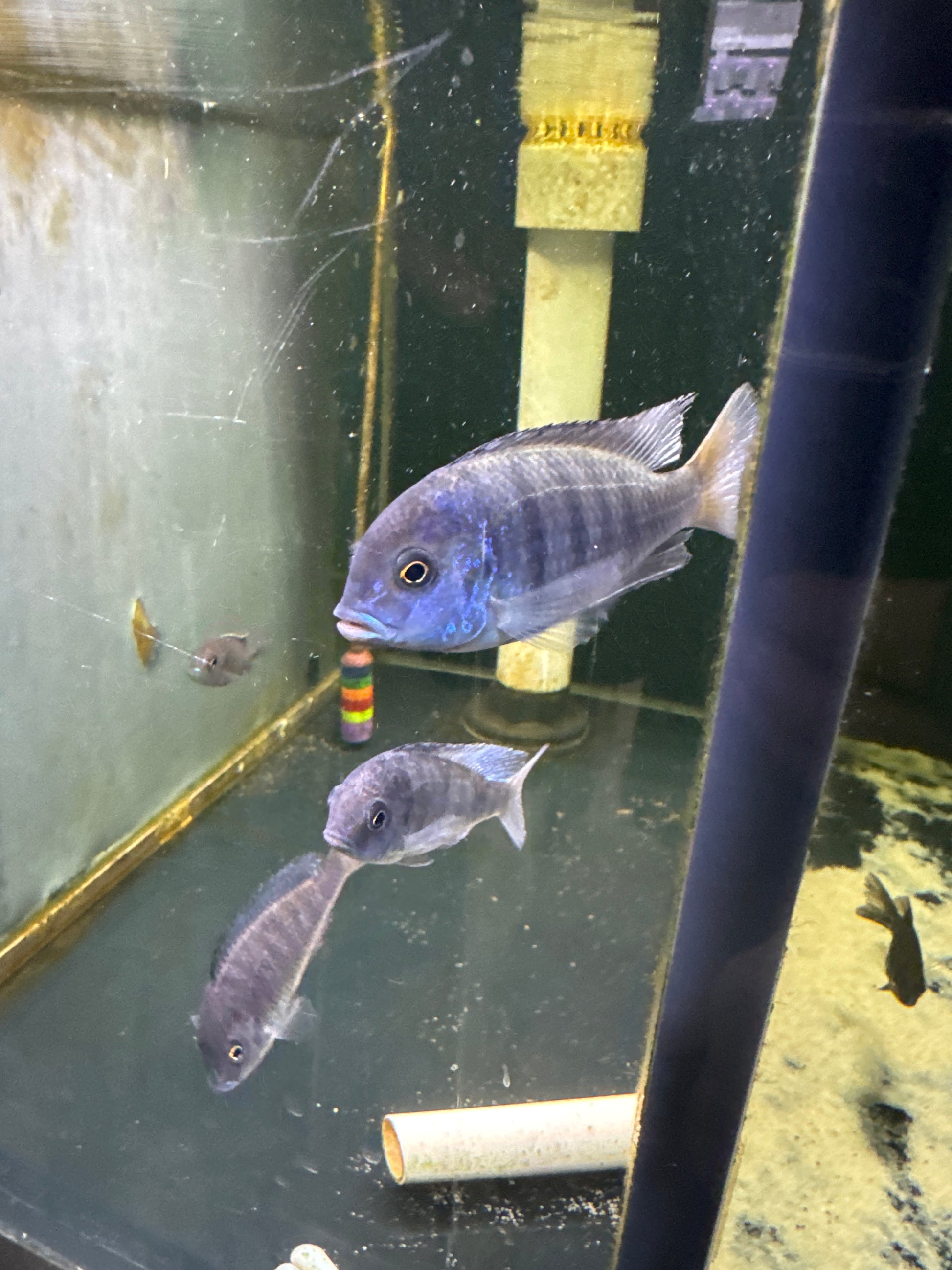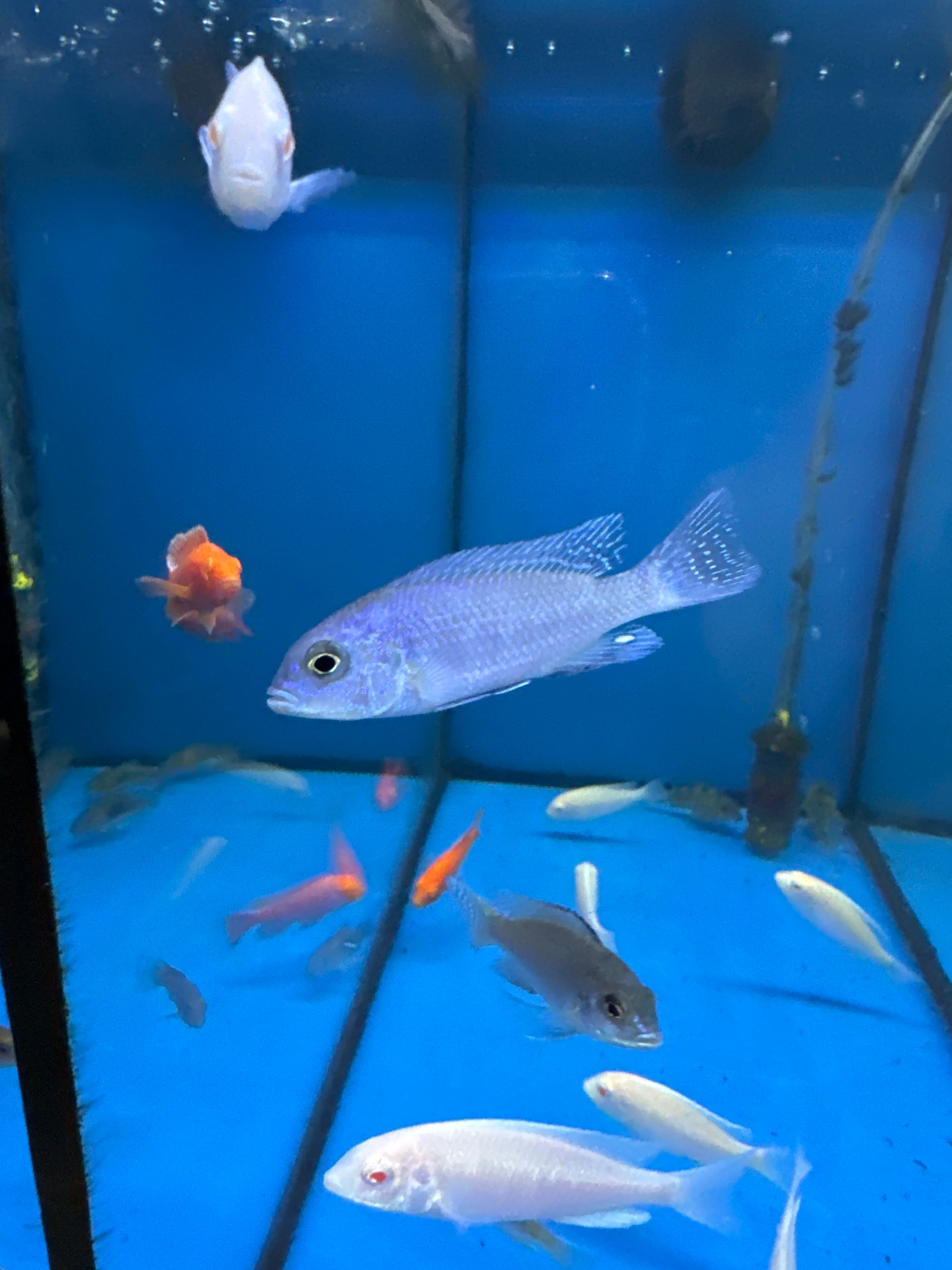 The Blue dolphin is a cichlid with a deep blue color a plump body that is quite long they can reach up to a large size of 25cm the male will have a more vibrant blue color than the female as these fish mature they can get somewhat aggressive and display almost black fins and head