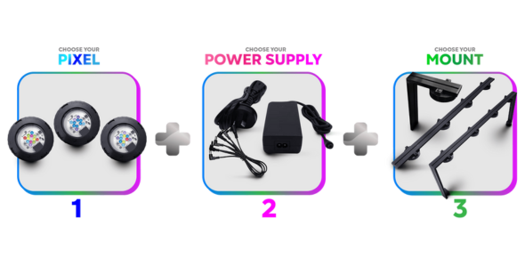 - Choose the Power Supply for now or for future requirements. For example, fewer Pixels can run on larger power supplies such as a Quad Power supply can run 1, 2 3 or 4 Pixels.