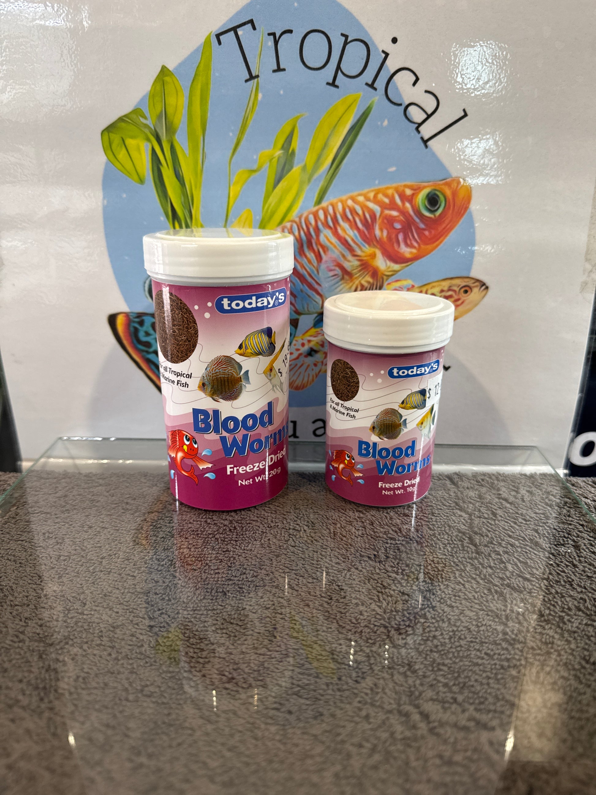 Today's Blood Worms are 100% freeze dried red mosquito larvae with no fillers or additives, only the moisture has been removed. This eagerly accepted treat is enjoyed by discus,bettas and most community fish. Ingredients: 100% bloodworms.